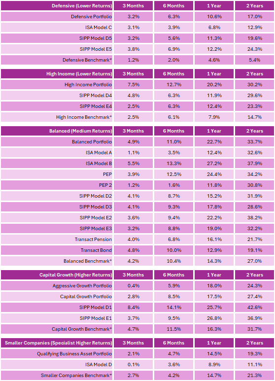 We are delighted to publish the aggregate performance of each of our investment strategies for a series of time periods. For each strategy we have selected an appropriate benchmark so you can consider their absolute and relative returns over different periods. The table will be updated with each new month and typically four weeks after month-end.